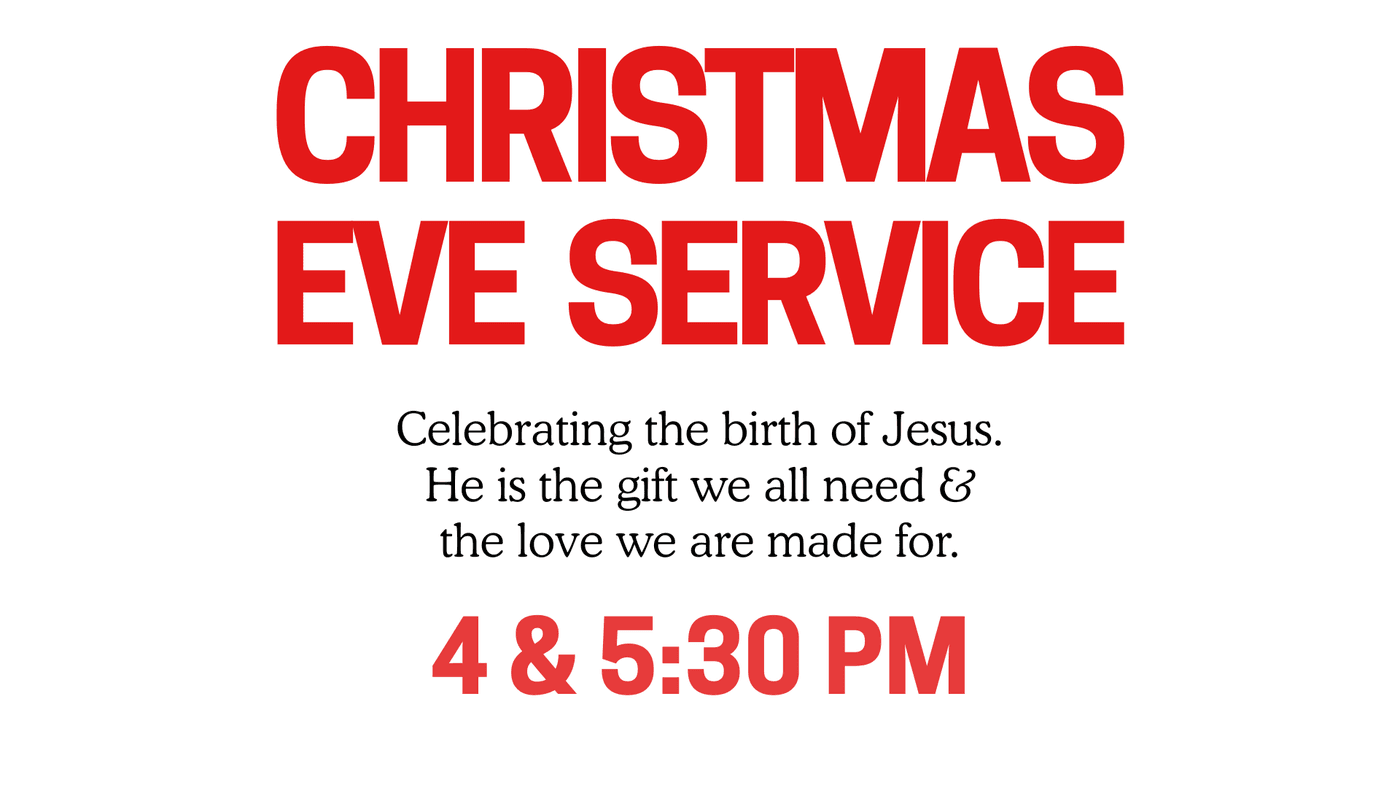 You're invited on Wednesday, December 24 at 4 or 5:30 pm. It's a family style service. All are welcome to worship together. Our time will be spent praising God and a message commemorating the birth of our Savior, Jesus. And back by popular request, a candlelight finish.