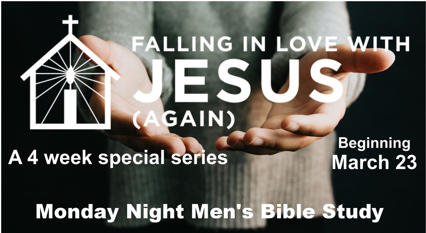3/23 || 6:30pm - The Monday night men's study is starting a special 4 week study starting March 23rd. It is called Falling in love with Jesus (Again). It is based on Revelation 2:4-6 The charge to the church of Ephesus to Remember from where they have fallen, Repent and Return to do the first works.